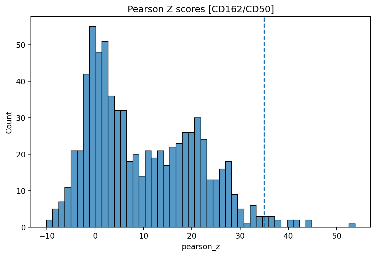 Next, we will select components with high colocalization scores for CD162/CD50. In the histogram below, we see the distribution of Pearson Z scores for the CD162/CD50 colocalization. Since we want to narrow down the selection of components, we set a threshold for the Pearson Z scores. Here, we use a threshold of 35 to keep the components with the highest colocalization scores. Note that the threshold is arbitrary and should be adjusted based on the data.