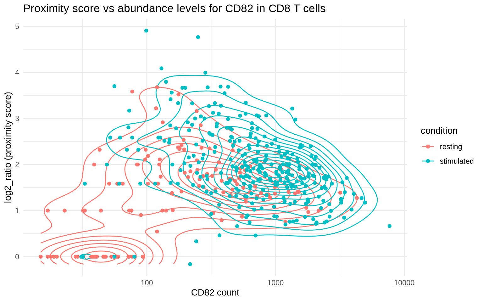 title = "Proximity score vs abundance levels for CD82 in CD8 T cells")