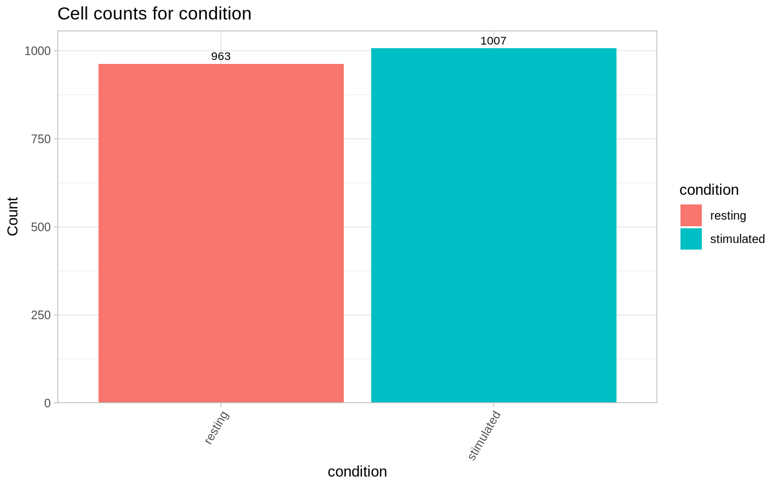 Now we can inspect the number of called cells per condition after filtering out small cells. The observed numbers of cells are close to the expectation of 1000 cells per condition.