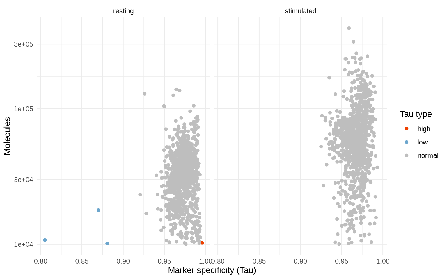 Below, we have plotted the number of molecules against Tau, and colored each cell by Pixelator’s classification of Tau (low, normal, or high). In short, Tau measures the heterogeneity of protein composition which can be used to detect various types of outliers. Here we see some cells with low a Tau score that might be antibody aggregates. Cells with high Tau have low specificity and could for instance include a more heterogeneous composition of proteins than we would expect from a normal cell. As these outliers likely represent technical artefacts, we will remove them from the dataset.