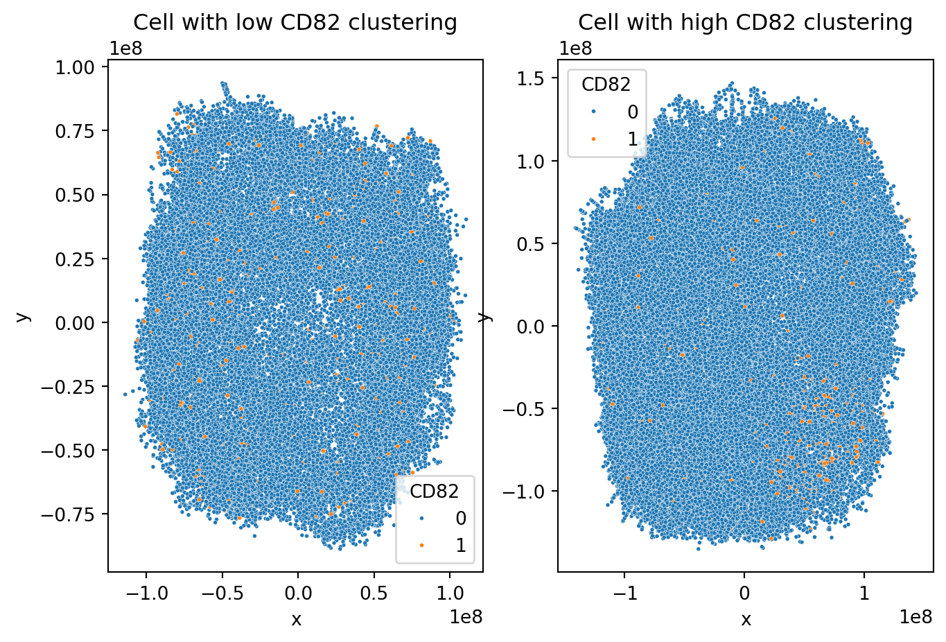 We see that in the cell with lower clustering, CD82 proteins are scattered quite uniformly across the sample while in the cell with higher CD82 clustering, there is a dense region of CD82 proteins in the top right corner.