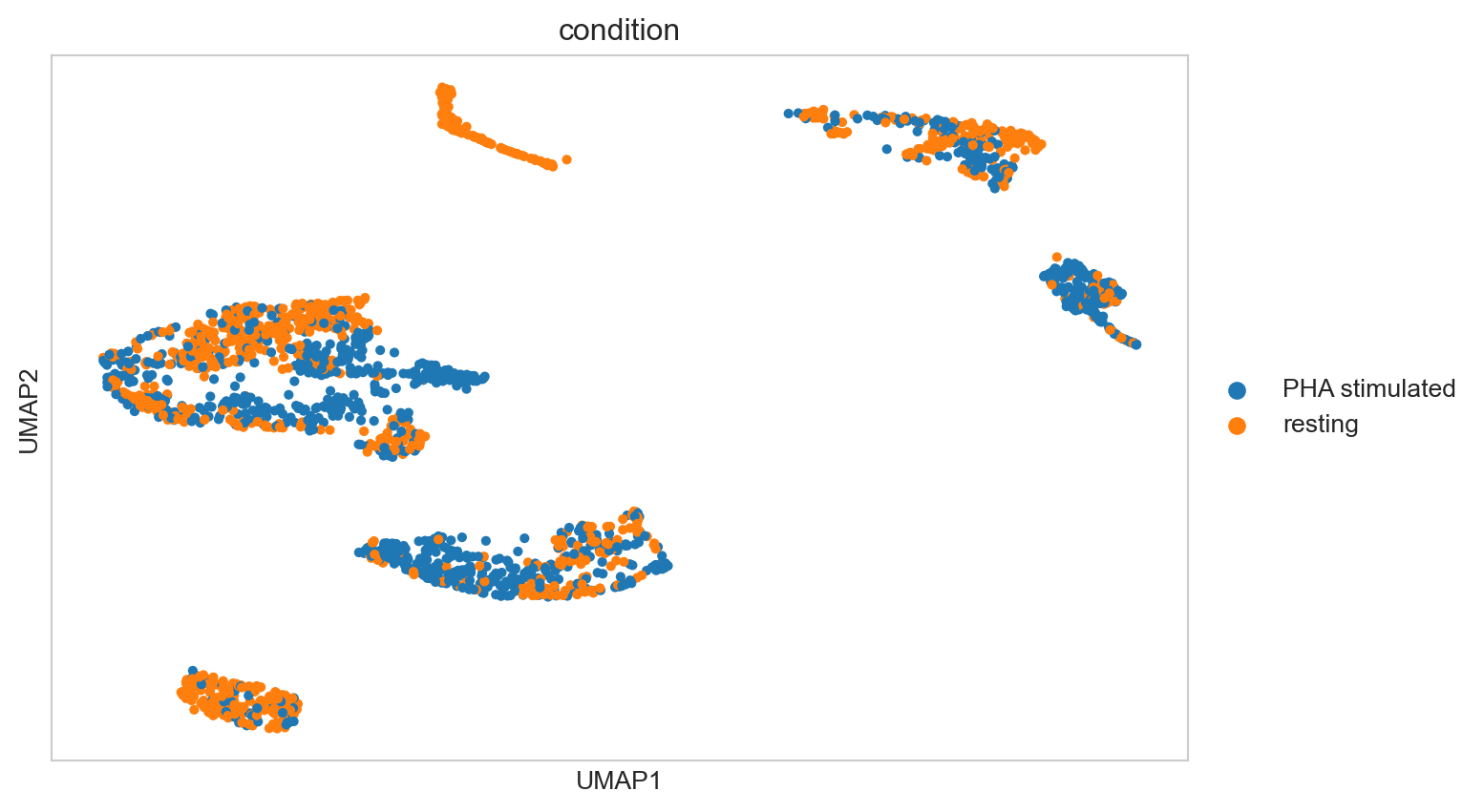 We are interested in the abundance differences, so we want to perform a correction that doesn’t eliminate these, but allows us to compare the same corresponding cell types across the samples in a meaningful way. Harmony uses the PCA embedding we previously generated and corrects them for specified covariates present as a column in the object. In this case, we will correct for the condition and sample variable. Harmony will create a new set of embeddings that we can use instead of the PCA. We can then use these Harmony embedding for downstream analysis, such as UMAP and clustering. To do this, we first add the condition variables to the meta data of the AnnData object.