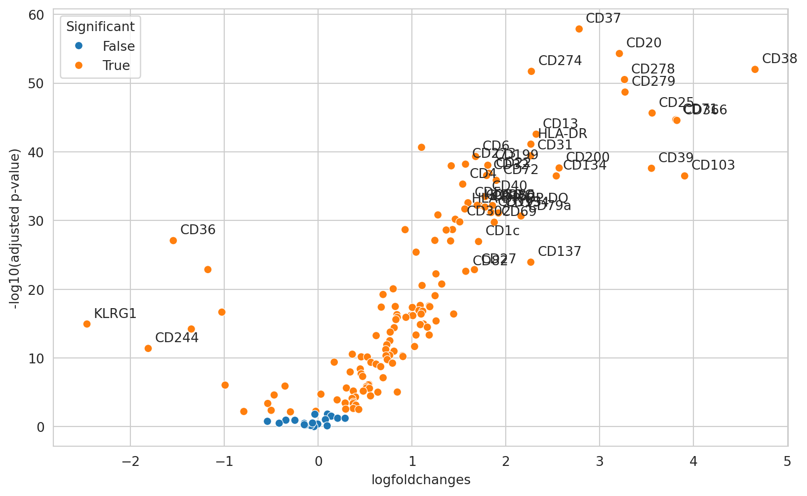 Let’s visualize these results as a volcano plot and annotate some T cell-relevant markers