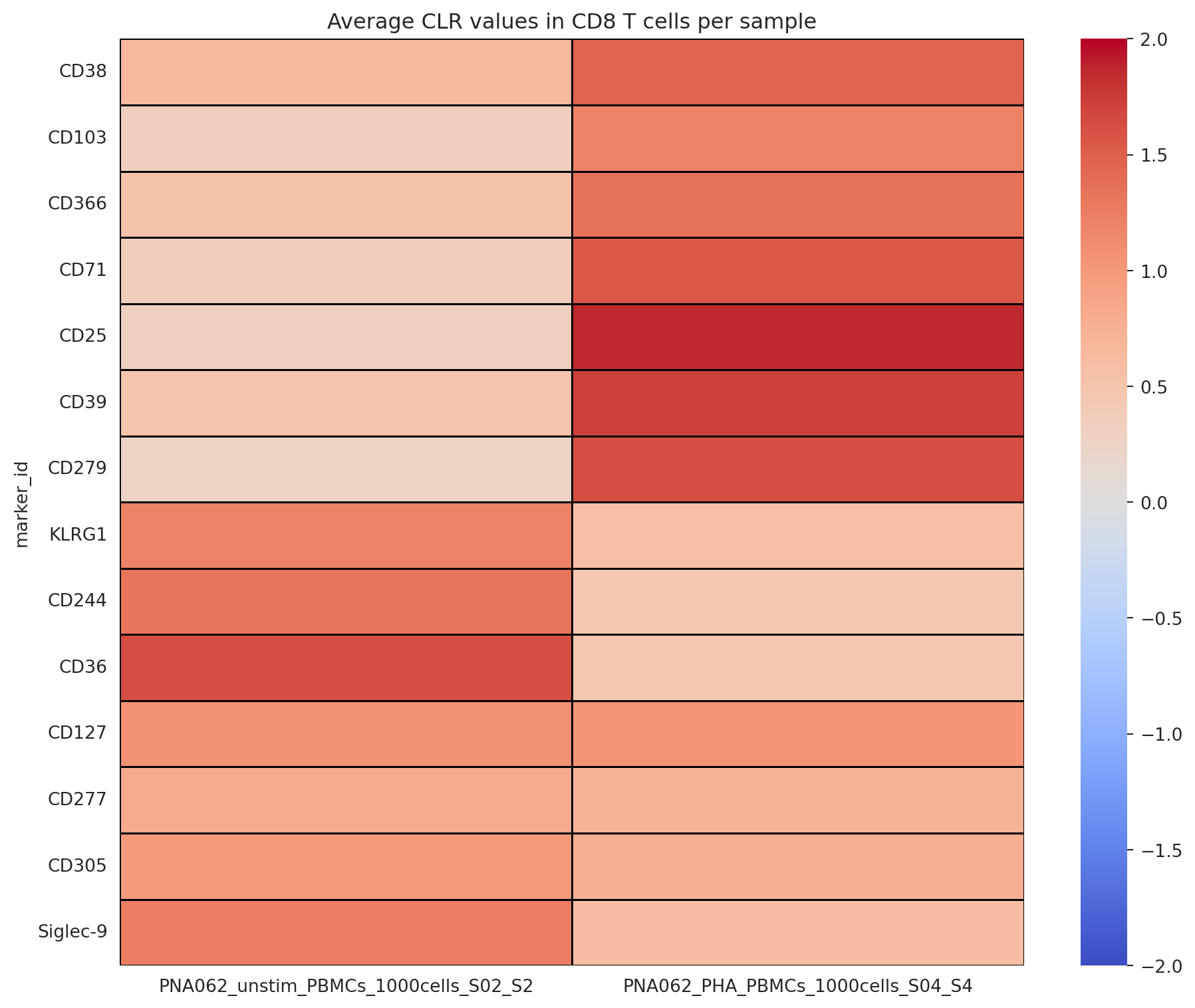 In this example, it seems that many of the T cell relevant markers (such as CD71, CD38 and CD25) show a significant increase in abundance upon PHA stimulation.