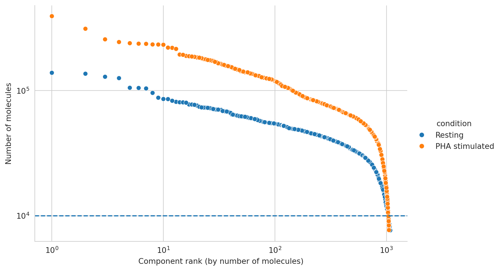 It looks like components are declining rapidly in size at around 10000 molecules, and we will thus set a manual cutoff at that point, represented by a dashed line.