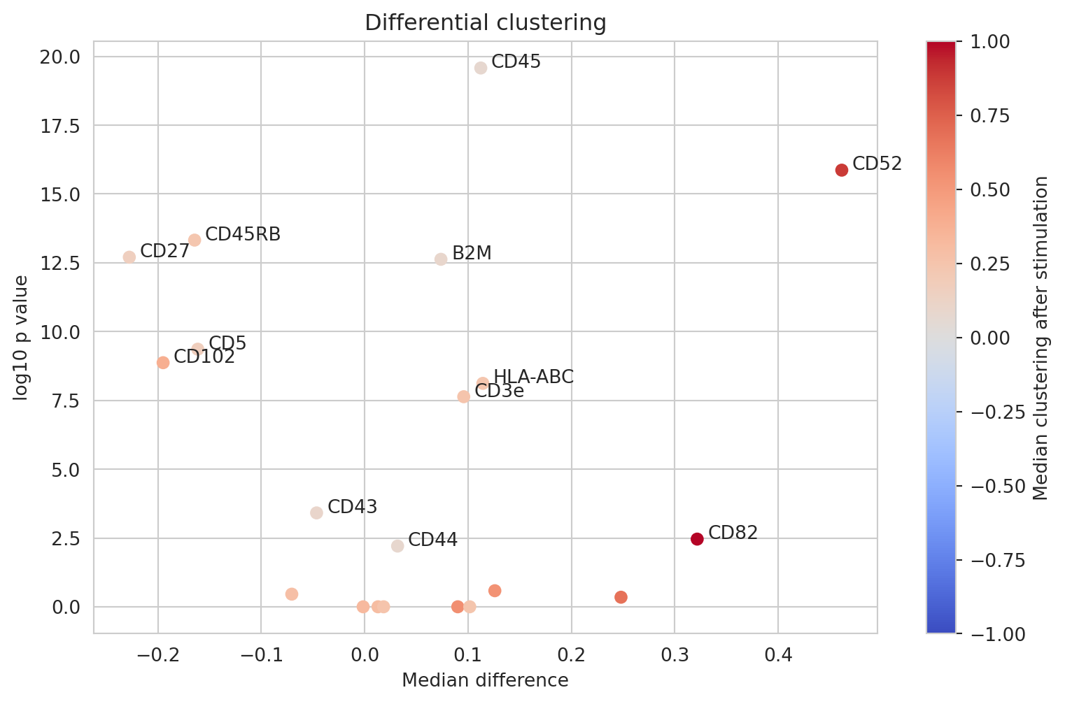 As the most significant signals, we see that CD82 and CD52 become significantly clustered only after PHA stimulation while for example CD8 is significantly clustered in both conditions.